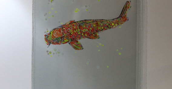 This work of art captures a fish flowing serenely through uncharted waters, symbolizing gradual and subtle self-development gained through life experience.